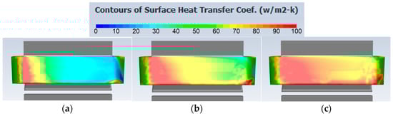 The distribution of the surface heat transfer coefficients is presented in Figure 13, with the typical winding–winding channel widths ranging from 0.5 mm to 1.5 mm. It can be observed that, in terms of the 0.5 mm channel width, the winding surface towards the downwind-side end windings presents much worse heat transfer coefficients than that near the upwind-side end windings. The highest heat transfer coefficient at the upwind side is more than 100 W/m2/K, while the lowest near the downwind side is less than 10 W/m2/K. This is because the air slows down as it flows axially down the narrow 0.5 mm channel. The improvement is significant when increasing the winding–winding channel width to 1.0 mm and 1.5 mm. Generally, the lower part of the winding has a better heat transfer coefficient than the higher part, due to the airflow adjacent to the stator tooth tip.