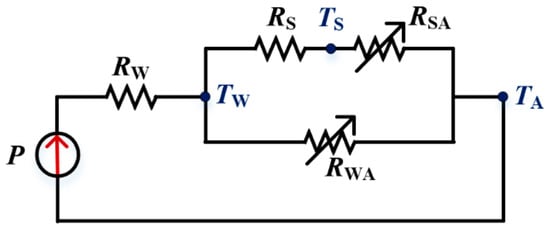 In the context of industrial design, understanding the intricacies of heat transfer mechanisms, specifically conduction and convection, is of paramount importance. To facilitate this comprehension, a thermal equivalent circuit has been distilled from the optimised design, which is explained in Figure 14. In this representation, the variables P (W), R (K/W), and T (K) signify the user-defined heat power, equivalent thermal resistance, and local temperature, respectively. Furthermore, the subscripts W, S, and A correspond to the winding, stator, and ambient conditions, respectively. It should be noted that RS encompasses the thermal resistance attributable to conduction within the stator, inclusive of slot liners. The thermal resistances RSA and RWA are indicative of the convective heat transfer from the stator laminations to the ambient environment and from the winding to the ambient environment, respectively. These resistances are modifiable through the manipulation of convective parameters such as air velocity and turbulence intensity. Quantification of these thermal resistances can be achieved through the employment of mean heat transfer coefficients.