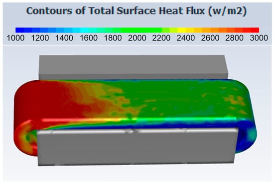 Total surface heat flux distributions through the conduction route in the optimised design. The flow direction is from left to right.