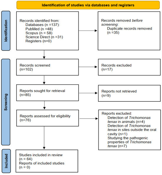 We found 137 records from the Scopus, PubMed, and ScienceDirect databases that were potentially relevant. The study selection process followed the PRISMA flow diagram (Figure 1). Initially, duplicates were removed, leaving 102 articles for screening. Seventeen were excluded due to general irrelevancy based on either title or abstract, and nine were excluded due to the lack of a full text. Of the remaining seventy-six articles, twelve were further removed for various reasons, including the detection of Trichomonas tenax in animals, extraoral detection of Trichomonas tenax, and in vitro studies. Ultimately, sixty-four research papers underwent qualitative analysis.