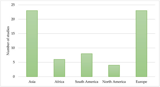 Number of studies available about the prevalence of Trichomonas tenax—distribution by continents. We were able to identify the fewest studies of Trichomonas tenax prevalence in North America, and the most in Asia and Europe.