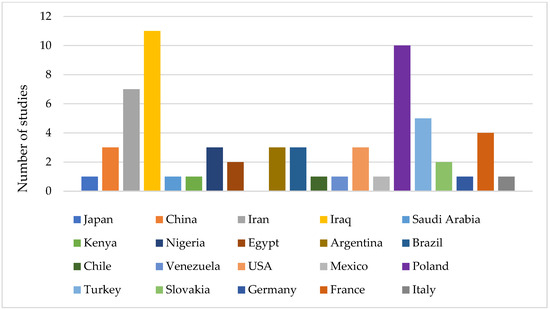 Number of studies available about the prevalence of Trichomonas tenax—distribution by countries. We found the fewest studies of Trichomonas tenax prevalence in Japan, Saudi Arabia, Kenya, Chile, Venezuela, Mexico, Italy, Germany and the most in Iraq, Poland and Iran.