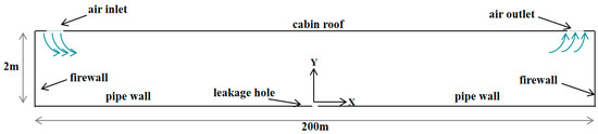 This study focuses on the changing law of HBNG concentration in the longitudinal dimension, so a fire protection zone was selected as the object of study, and a two-dimensional physical model was constructed in the longitudinal direction for a 200 m × 2 m × 2 m fire protection zone of a natural gas compartment. The HBNG pipe of the model has a diameter of DN300 and is located 2 m from the top of the cabin. The air supply and exhaust openings, each measuring 1 m × 1 m, are positioned 1 m apart from the left and right edges of the firewall. Due to the lower density of HBNG in comparison to air and its natural tendency to rise following a leak, only the portion above the pipe wall is retained. The physical model of the natural gas compartment developed in this study is shown in Figure 1.