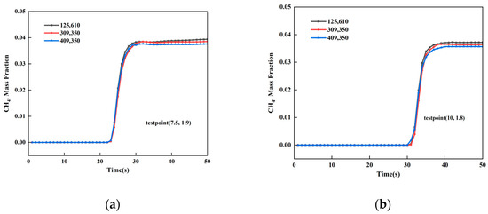To assess grid independence, three different grid schemes with 125,610, 309,350, and 409,350 grid counts are used in case 1 for comparative analysis. Figure 3 illustrates the methane distribution of the three grid schemes at test points 1 (7.5, 1.9) and 2 (10, 1.8).