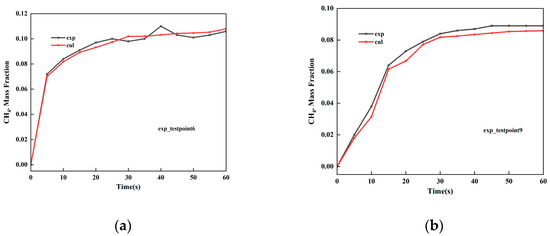 Comparison of simulated and experimental values: experimental sampling point (a) No. 6 and (b) No. 9.