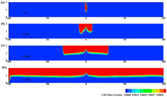 Natural ventilation natural gas compartments leakage concentration distribution of pure methane natural gas (HBR = 0%), (a) t = 6 s, (b) t = 30 s, (c) t = 150 s, (d) t = 360 s.