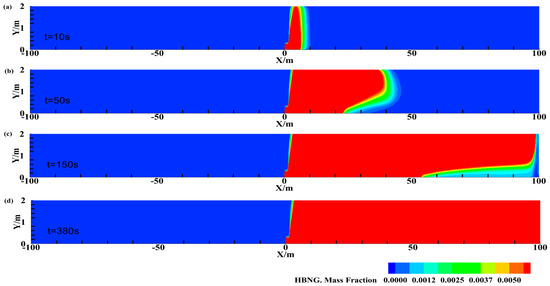 Normal ventilation natural gas compartments leakage concentration distribution of pure methane natural gas (HBR = 15%), (a) t = 10 s, (b) t = 50 s, (c) t = 150 s, (d) t = 380 s. Natural ventilation natural gas compartments leakage concentration distribution of pure methane natural gas (HBR = 0%), (a) t = 6 s, (b) t = 30 s, (c) t = 150 s, (d) t = 360 s.