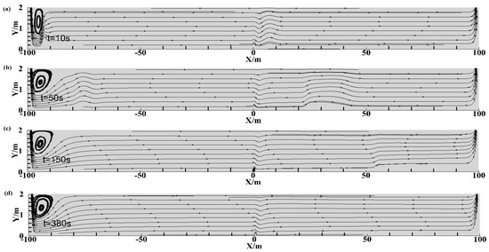 Distribution of leakage flow lines in the pipeline corridor under normal ventilation conditions for HBNG (HBR = 15%), (a) t = 10 s, (b) t = 50 s, (c) t = 150 s, (d) t = 380 s.