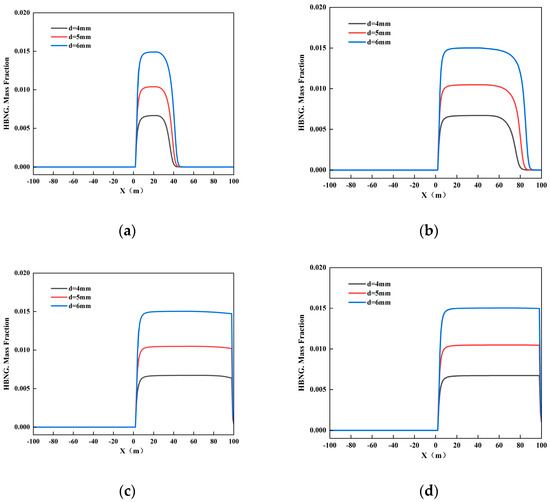 Comparative analyses were carried out for cases 4, 6, and 7. The research produced graphs showing how the gas concentration changed when HBNG leaked through different leakage holes while the ventilation mode was normal (see Figure 9). As the size of the hole rises, the total momentum of the gas leakage jet containing hydrogen increases, resulting in an improved spread of the HBNG. Over the same amount of time, there were mostly no changes in the longitudinal distribution pattern of HBNG on the monitoring line when the leakage aperture conditions were different. The HBNG concentration on the monitoring line at t = 150 s exhibited a progressive and smooth distribution. The mass fractions for the leakage aperture diameters of 4 mm, 5 mm, and 6 mm were 0.00672, 0.01047, and 0.0150, respectively.