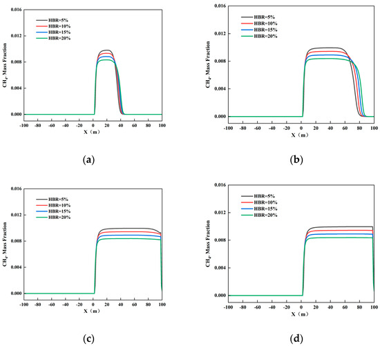 Variation of gas concentration in HBNG leakage with different HBR, (a) t = 50 s, (b) t = 100 s, (c) t = 150 s, (d) t = 200 s.