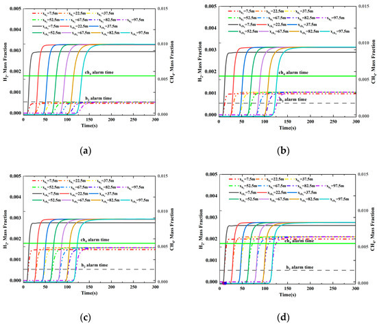 The components hydrogen and methane in gas leaks with varying HBR at different monitoring points, (a) HBR = 5%, (b) HBR = 10%, (c) HBR = 15%, (d) HBR = 20%.