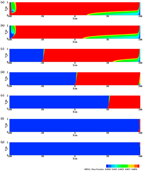 Variation of gas concentration in HBNG leakage with different leakage location (a) x = −99.5, (b) x = −97.5, (c) x = −50, (d) x = 0, (e) x = 50, (f) x = 97.5, (g) x = 99.5.