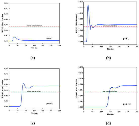 In accordance with [14], the upper limit for the concentration of natural gas in an alarm should not exceed 20% LEL. This study defines the “infringement distance” as the distance at which the HBR reaches 20% LEL. The concentration at the point that catches 20% LEL is referred to as the “alarm concentration,” and the time at which it reaches this concentration is called the “alarm time.”