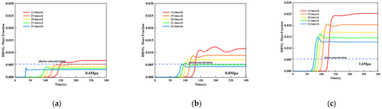 A comparative study of cases 4, 8, and 9 was carried out to obtain the graphs of gas concentration changes for HBNG leakage under normal ventilation conditions with different pipeline pressures (Figure 10). The spatial distribution of HBNG in a pipeline at various pressures closely resembles the spatial diffusion pattern of HBNG under different conditions of leakage port aperture. An increase in leakage pressure will result in a corresponding increase in the flow and velocity at the leaking opening. This outcome leads to the HBNG jet possessing a higher momentum, enabling it to disperse more vigorously in all directions. Furthermore, the dispersion of jets is proportionally decreased due to the dissipation of turbulence on a small scale. At a particular time, as the pipeline pressure increases, the HBNG diffusion range is expanded accordingly, and the concentration of HBNG in the corresponding area is more likely to reach the LEL. The risk of accidents increases significantly if higher-pressure pipelines leak within a natural gas compartment. Therefore, it is essential to enforce more rigorous security measures for HBNG pipelines working under higher pressure.
