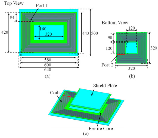 Schematic of WPT coils (unit: mm): (a) transmitting coils, (b) receiving coils, and (c) positions.