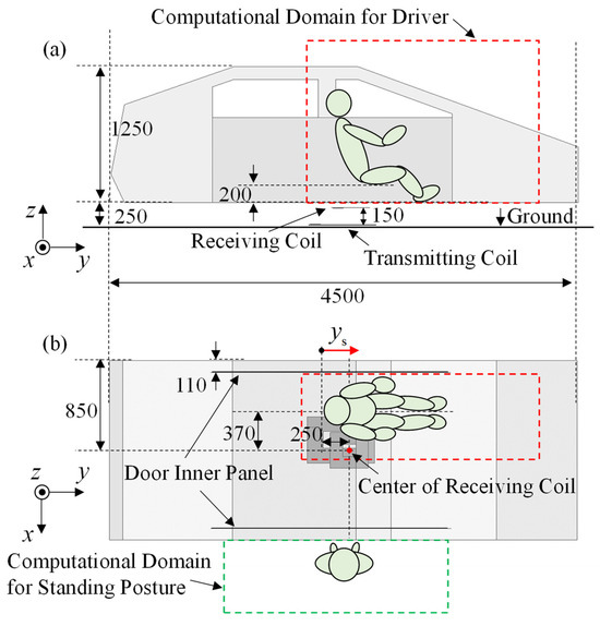 Figure 3 shows a vehicle model and two realistic exposure scenarios for the assessment. The simplified vehicle’s geometry was developed using the Toyota Motor Corporation’s Prius model and was positioned in free space. Note that the effect of the ground and surrounding objects marginally influences the magnetic field where the quasi-magnetostatic approximation is valid. The receiving coil was positioned beneath the center of the vehicle body. Misalignment between the receiving and transmitting coils were chosen as 75 mm and 100 mm in the x and y directions, respectively, following SAE J2954 [16]. We considered two vehicle body materials, including iron and carbon fiber-reinforced plastic (CFRP). The relative permittivity, permeability, and conductivity values for iron and CFRP were 1, 4000, and 10.3 × 106 S/m and 1, 1, and 0.25 × 106 S/m, respectively. The thicknesses of iron and CFRP were 0.5 and 2.0 mm, respectively. In this study, two scenarios discussed in IEC JWG 63184 were considered. In the first scenario, a human body model stands outside the vehicle body where the highest exposure to the magnetic field from the WPT system was computed. Meanwhile, the human body in the second scenario was located in the driver’s seat, where the distance from the floor to the driver’s buttocks was 200 mm. Note that the position of the human body in the vehicle cabin has been standardized for such purposes [23,24,50].