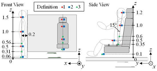 We outlined three definitions for each posture, as shown in Table 2 and Figure 4. In Definition 1 for outside the vehicle, the measurement point was defined at the heights of 0.5, 1.0, and 1.5 m from the ground based on IEC TR 62905. In Definition 1 for inside the vehicle, the measurement heights are 0.5, 1.0, and 1.2 m from the floor, corresponding to the cushion, chest, and head of the seat, respectively. In Definition 2, the closest accessible point was incorporated into Definition 1 based on IEC PAS 63184, considering the foot. In Definition 3, the measurement point was defined at the heights of the closest accessible point and two points, each 25 cm higher from it, aiming to be more stringent than Definitions 1 and 2. The measurement points of 0.35, 0.6, 1.0, and 1.2 were defined along a 15-degree angle of the seat to align with the central axis of the human body, considering the human body model sits in the driver’s seat in a realistic posture.
