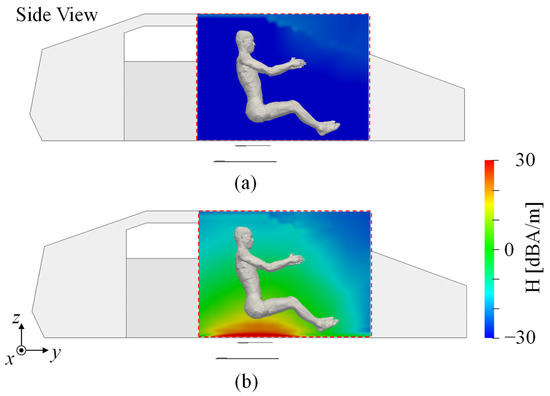 Figure 5 and Figure 6 show the magnetic field strength distributions outside and inside the vehicle, as viewed from the side of the vehicle, for different vehicle body materials. The computational domain is illustrated in Figure 3. As shown in Figure 5, there was no significant difference in the distribution between iron and CFRP outside the vehicle. In contrast, the magnetic field inside the vehicle was scarcely distributed for a body made of iron due to the shielding effect shown in Figure 6. In the case of the CFRP body, the magnetic field generated by the WPT system leaks directly into the cabin beneath the floor.