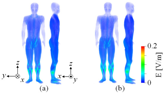 Internal electric field distributions in human body model inside the vehicle sitting on the driver’s seat for different materials: (a) iron and (b) CFRP.