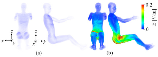 In this study, we employed an anatomical human body model TARO developed at the National Institute of Information and Communications Technology (NICT) [45]. The height and mass of the model is 173.2 cm and 65 kg, respectively. The number of tissues considered in TARO is 51. The voxel resolution of the human model was set at 2.0 mm. Two distinct postures were considered for the models, including the original standing posture and a seated posture simulating a driver’s position, as illustrated in Figure 1. The seated model was created utilizing software provided by NICT [46]. The posture of the driving seat has been generated considering [47].