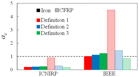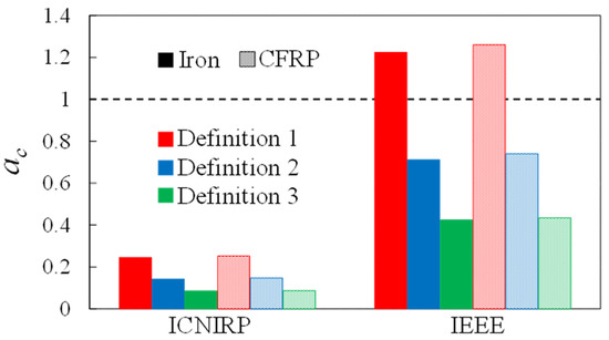 Table 4 presents the magnetic field strength inside the vehicle at the measurement points and Have for different materials (ys = 0). As shown in Table 4, the magnetic field strength within the iron body was two orders of magnitude lower than that within the CFRP body. Figure 11 shows the conformity assessment in each definition for the ICNIRP guidelines and IEEE standard in terms of ac inside the vehicle (ys = 0). As shown in the figure, all definitions in the case of the iron body exhibited a conservativeness with more than a margin of a factor of four with respect to the ICNIRP guidelines, whereas they were either comparable or unconservative with respect to the IEEE standard. In contrast, for the CFRP body, Definition 1 provided a level of protection equivalent to the ICNIRP guidelines. Definitions 2 and 3 displayed a conservativeness with more than a margin of a factor of 3.4 with respect to the ICNIRP guidelines. In the IEEE standard, Definitions 1 and 2 were unconservative, whereas Definition 3 exhibited a conservativeness with more than a margin of a factor of 1.2.