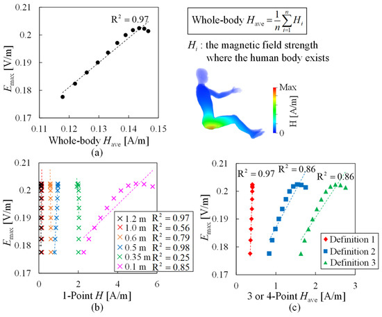 Figure 10a shows the relationship between the average magnetic field strength within the volume containing the human body model and the internal electric field. The average magnetic field was determined by calculating the arithmetic mean of the absolute magnetic field values over the whole body. The correlation has been evaluated in terms of coefficient of determination (R2) [60,61] assuming the linear relationship. If they are correlated linearly, the induced electric field can be equivalently evaluated in terms of average magnetic field without detailed computation. There was a strong correlation between the whole-body Have and the internal electric field. Figure 10b shows the relationship between the magnetic field strength at a single measurement point defined in Table 2 and the internal electric field. As shown in Figure 10b, good correlations were observed at specific points, such as 0.1, 0.5, and 1.2 m. However, there was no consistent trend for the other measurement points. Figure 10c shows the relationship between the average magnetic and internal electric fields at three or four points outlined for each definition. As shown in Figure 10c, the average magnetic field reasonably correlates with the internal electric field across all definitions. In Definitions 2 and 3, Emax reached its peak because the exposure area from the buttocks to the feet approaches a certain level when the seat is moved backward.