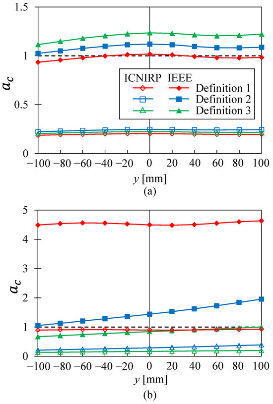 Figure 12 shows the assessment of each definition for compliance with the ICNIRP guidelines and IEEE standard using ac when the vehicle seat position was changed in the front–back direction (ys = ±100 mm). As shown in Figure 12, the variation in ac in the case of the iron body remained relatively insignificant due to the weak nonuniformity of the magnetic field distribution. In contrast, for the CFRP body, ac varied from approximately −0.1% to 3%, −27% to 36%, and −21% to 18% in Definitions 1, 2, and 3, respectively, regardless of the target guidelines. The variability in Definitions 2 and 3 is influenced by the observation that the variation in Have considering the measurement point at the lower limb is larger than that of Emax appearing at the buttocks. However, by adding a reduction factor smaller than two, such an effect of variations is sufficiently avoided.