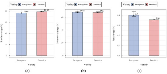 As can be seen in Table 2, the effect of the covariate related to the initial value of each parameter on the final value obtained in the chips was analyzed using the ANCOVA test. This allowed for the verification of the fact that the initial effect of each covariate was not significant for the variables moisture, starch, fiber, ash, and fat. Therefore, it cannot be asserted that the initial values of each of these parameters had an impact on the final result. Additionally, in Figure 3, it can be observed that there are significant differences between the various treatments for each evaluated variable. However, as the significance level was not reached, these effects are analyzed in Section 3.3.
