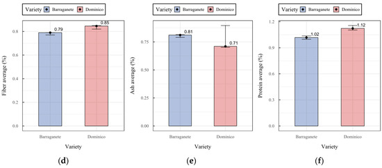 Results of the ANOVA tests and paired contrasts using the Tukey test for each evaluated variable: (a) starch average, (b) moisture average, (c) fat average, (d) fiber average, (e) ash average, and (f) protein average.