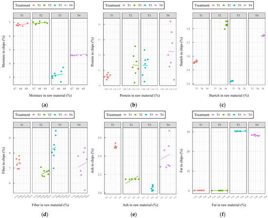 Regression graphs obtained for the ANCOVA tests for the final product parameters based on the raw material parameters. The variables used were (a) moisture, (b) protein, (c) starch, (d) fiber, (e) ash, and (f) fat.