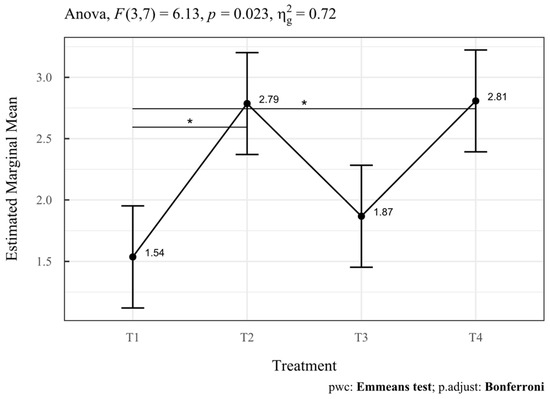 Estimated Marginal Means test used to compare the final protein content for each treatment employed. * Significant contrasts.
