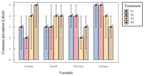 As the last experimental stage, a sensory analysis was carried out for the final products obtained, which was applied by collecting a sample of 320 observations collected by 80 panelists who evaluated each of the products, generating 80 observations for each treatment used. The sensory analysis instrument comprised four ordinal variables on a five-level Likert scale. Each individual rated the chips’ color, smell, flavor, and texture without knowing which treatment they corresponded to, where a score of 1 corresponded to the lowest level and a score of 5 corresponded to the highest level following each participant’s perception. The data collected for sensory analysis were treated using Mahalanobis distances to detect atypical data, and no atypical observations were identified. Subsequently, given the ordinal nature of the data, the one-way Kruskal–Wallis test was applied as a general test, and the pairwise Wilcoxon signed rank test was applied as a paired test for identifying significant differences in the sensory analysis. The results of this analysis are presented in Table 6 and Figure 6. Additionally, Figure 7 presents demonstrative images of the final products obtained through each treatment.