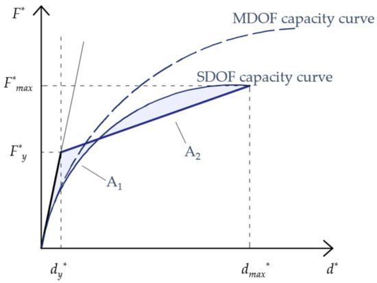 The Commentary to the IBC [31], in paragraph §C7.3.4.2, provides guidance for the application of Non-Linear Static Analyses (NLSAs). In such analyses, the structure is described through its capacity curve Fb–dc, where Fb is the shear force at the base and dc is the displacement of a control point, which usually coincides with the center of mass of the top floor. For each limit state, the performance level is determined by comparing the capacity curve to the spectral demand. To perform such comparison, the structural system is replaced by an equivalent Single-Degree-of-Freedom (SDOF) system through Equations (1)–(3), and capacity curve Fb–dc of the physical Multi-Degree-of-Freedom (MDOF) system is replaced by the “reduced” capacity curve F*–d* of the equivalent SDOF system shown in Figure 1.