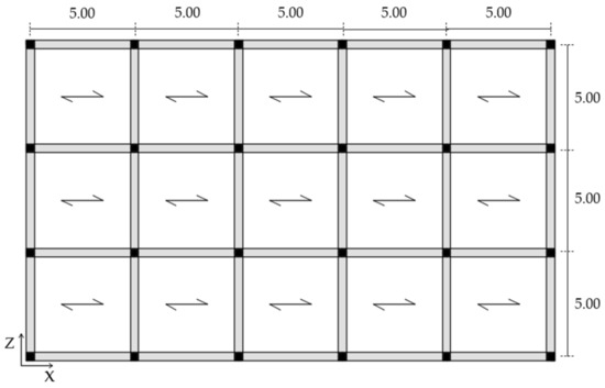 Two archetype buildings characterized by a RC moment-resisting frame taken from the literature [40] are assumed to be case studies. The first is a three-story building, and the second is a six-story building. Both buildings have the same 25 × 15 m2 plan shown in Figure 3 and composed by bays of 5 m in each horizontal direction.