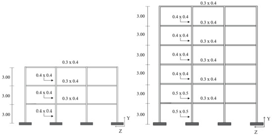 Elevation views of the case study structures with indication of the inter-story height and cross-sections of the structural elements (dimensions in m).