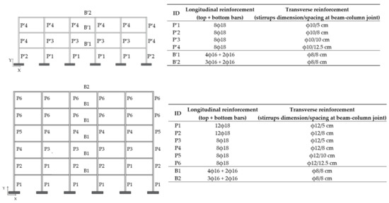 Figure 4 shows the elevation views with indication of the inter-story height and cross-sections of the structural members, while Figure 5 reports the reinforcement of beams and columns.
