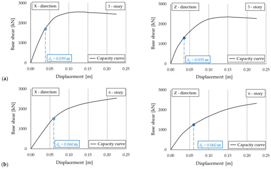 Capacity curves in X and Z directions for (a) a 3-story building and (b) a 6-story building with indication of the performance point with target displacement dp.
