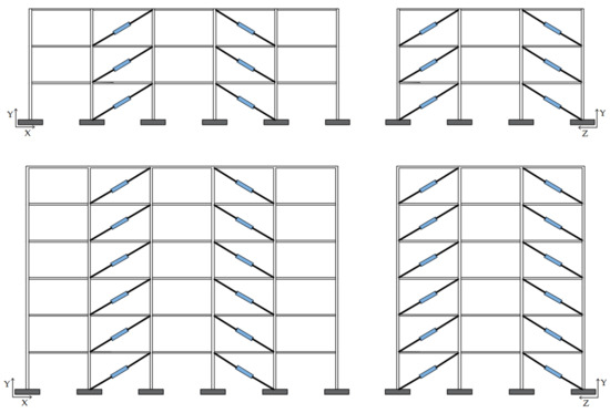 In this study, the two structures are retrofitted by using hysteretic steel dampers installed into diagonal steel braces (Figure 7), which is a common configuration for frame buildings [1,5,6,43,44,45]. An elastic–perfectly plastic constitutive behavior is assumed for the dampers, similarly to other studies [1,6,41,43,44]. Four units on each floor in both X and Z directions are installed in the external bays according to the layout shown in Figure 7.