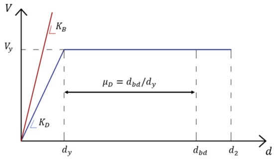 The mechanical properties of each diagonal steel brace and the encased hysteretic steel damper form an in-series system can be expressed as a combination of the properties of the linear elastic brace (B) and of the elasto-plastic damper (D), as shown in Figure 8, where KB and KD are the elastic stiffnesses of the brace and of the damper, Vy is the maximum force of the damper, dy, dbd and d2 are the yield displacement, the design seismic displacement calculated at LLS and the ultimate displacement of the damper at CLS, respectively. Damper ductility μD, defined as the ratio between dbd and yield deflection dy, for standard steel hysteretic dampers typically ranges between and 16 [1,15,41,43]. The properties of the single damped brace (DB), in terms of stiffness KDB, ductility μDB, and damping capacity ξDB, are determined through the Equations (6)–(8), where ratio KB/KD between the stiffnesses of the steel brace and the damper should be taken ≥2 in order to guarantee that the largest part of the deformation of the story is concentrated in the damper [45,46]. Typical values of μDB and ξDB for damped bracing systems according to current practice are reported in Table 1 [15,43,44]. Therefore, in the study, the seismic upgrade of the case study buildings is performed considering damped brace systems characterized by values of ductility μDB ranging from 3 to 13.5; more specifically, μDBs equal to 3, 5, 7, 9, 11, and 13.5 are assumed.