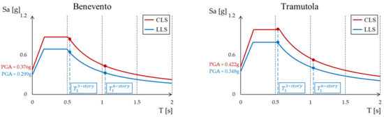 The NLTHAs are conducted in accordance with the provisions of the IBC [30] referring to the seismic action in the municipalities of Benevento (soil type B and T1 category) and Tramutola (soil type C and T1 category). Two limit states characterized from different return periods of the design earthquake are considered, namely (i) the Life safety Limit State (LLS) with return period TR = 475 years and (ii) the Collapse Limit State (CLS) with return period TR = 975 years. Figure 10 shows the ξ = 5% damped spectra with indication of the PGAs at either site for the two limit states and the fundamental period of each building.