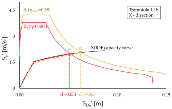 As an example, Figure 11 shows the results at LLS for the six-story building in Tramutola retrofitted with damped braces with ductility μDB = 9. The damped spectrum depicted in red corresponds to the damping reduction factor η resulting from the actual evaluated as which in this case amounts to 0.487. The yellow curve refers to the case in which the damping reduction factor is evaluated in accordance with the IBC [30] as . The actual η results in a −22.4% in the displacement at roof level and −4.1% in the global shear force in comparison to the values calculated by assuming ηIBC.