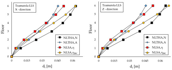 For the same case study structure, Figure 12 shows the comparison between the maximum displacements at each floor obtained from static and dynamic non-linear analyses in X and Z directions. In the graph, NLTHA,N and NLTHA,A stand for Non-Linear Time-History analyses with either natural (N) or artificial (A) accelerograms, while NLSA,η and NLSA,ηIBC refer to non-linear static analyses considering either η or ηIBC, respectively. NLTHA,N calculates the largest displacements at each floor, but the last one where its results are similar (or even smaller than) to NLSA,ηIBC. For the first three floors, NLTHA,A, NLSA,η, and NLSA,ηIBC provide consistent results, smaller than those calculated from NLTHA,N, but their estimates diverge at the upper floors. Regarding the displacement of the control point, curiously, in the X direction, the maximum and minimum values are calculated by the two time-history analyses, with a deviation of about 27% in the X direction and 29% in the Z direction; in the Z direction, the largest displacement is calculated by NLSA,ηIBC. There is a deviation of approximately 19% in both directions between NLSA,η and NLTHA,N, while NLSA,ηIBC yields results quite similar to those of NLTHA,N, with a difference of about 5% at the top floor in the Z direction.