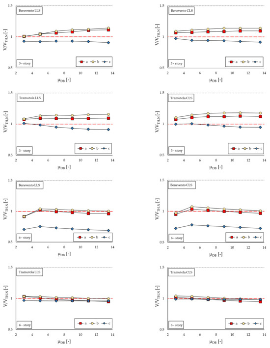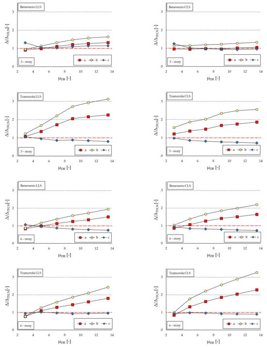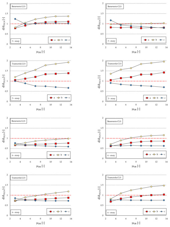 The deviation on the top building displacement is examined in Figure 13. For the three-story building, NLSAs overestimate the top building displacement calculated by NLTHA,N except for Benevento (CLS) where d/dTH,N is approximately equal to unity for NLSA,ηIBC, and about 0.8 for NLSA,η. Also, in the case of Benevento (LLS), for μDB = 3, NLSA,ηIBC underestimates the results from NLTHA,N. Considering the site of Tramutola, for both limit states, d/dTH,N ranges from 1.05 to 1.40 for NLSA,η and from 1.20 to about 2.0 for NLSA,ηIBC.