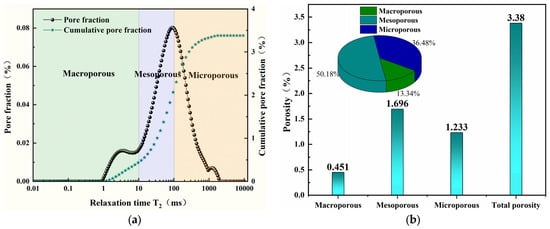 In conjunction with the relevant literature, the pore size of sandstone can be divided into three intervals: microporous (), mesoporous () and macroporous () [30,31,32]. Based on Formula (2), it can be deduced that the transverse relaxation time spectrum ranges from 0 to 10 ms for microporous, from 10 to 100 ms for mesoporous, and above 100 ms for macroporous.
