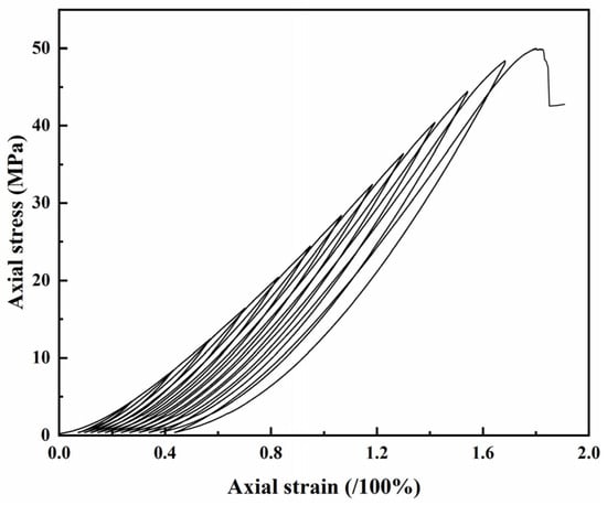 Figure 4 presents the stress–strain curve of the sandstone. The initial part of the curve is relatively dense, and as the loading progresses, the curve becomes more dispersed, exhibiting an overall pattern of “dense-sparse” variation. The research found that in the later stages of loading, the curve significantly deviates from the historical stress–strain curve. This deviation is attributed to the cumulative damage caused by fatigue loading, which leads to an increase in internal structural damage within the sandstone [33,34].