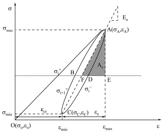In the above equation, , and represent the total energy, elastic strain energy, and dissipated energy for the -th loading cycle, respectively; and represent the stress during the loading phase and the stress during the unloading phase, respectively; and , and correspond to the abscissa coordinates of points O, A, and C in Figure 5, respectively. The dissipated energy generated by cyclic loading and unloading is further divided into damping energy and plastic damage energy . The damping energy is primarily the energy consumed by the hysteresis loop to overcome the viscosity of the rock, while the damage energy is associated with the initiation and development of microcracks within the rock, leading to plastic deformation, which is the dissipated energy minus the damping energy [40,41]: