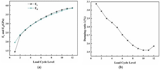 - As the cyclic load level increases, both the elastic modulus and deformation modulus exhibit a “parabolic” increase, with a rapid increase at the beginning and a slower rate of increase later on. The damping ratio shows an overall decreasing trend but increases near the peak load, fluctuating between 2.5% and 3.0%.
