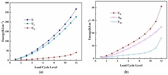 - Based on the dissipation energy theory, it was found that the total energy, elastic energy, dissipation energy, damping energy, and damage energy all follow exponential function increases with the load level. Moreover, there are sudden increases in dissipation energy and damage energy during the final loading and unloading stage. Additionally, the proportion of elastic energy increases first and then decreases following a “quadratic parabolic” pattern with the cyclic load level, while the proportion of dissipation energy shows the opposite trend.