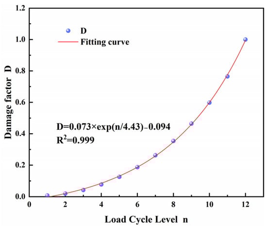 From Figure 8, it can be observed that as the loading cycle level gradually increases, the damage factor follows an exponential growth pattern, which further indicates that the damage caused by cyclic loading and unloading is a process that accumulates over time. Under low load conditions, the damage factor rises slowly, while it increases rapidly as it approaches the failure curve. This is primarily because, during this stage, microcracks extensively initiate, propagate, and connect, eventually forming macroscopic fractures. This leads to a significant release of energy to the surroundings, resulting in a gradual increase in dissipated energy.