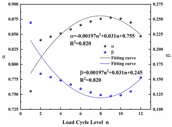 From Figure 9, it can be seen that the proportion of elastic energy, represented by α, exhibits a “quadratic parabola” pattern of initially increasing and then decreasing with the increase in loading cycle level, while the proportion of dissipated energy behaves in the exact opposite manner. During the initial loading, energy is primarily stored as elastic energy within the sandstone. Starting from the 8th loading cycle level, the proportion of elastic energy begins to decrease, while the proportion of dissipated energy does the opposite. The main reason for this is the initiation, propagation, and connection of sandstone cracks, as well as friction between internal particles, leading to a conversion of elastic energy into dissipated energy, and thus an increase in the proportion of dissipated energy. Consequently, when the load exceeds approximately 65% of the peak load, there is a change in the dominant form of energy [44].